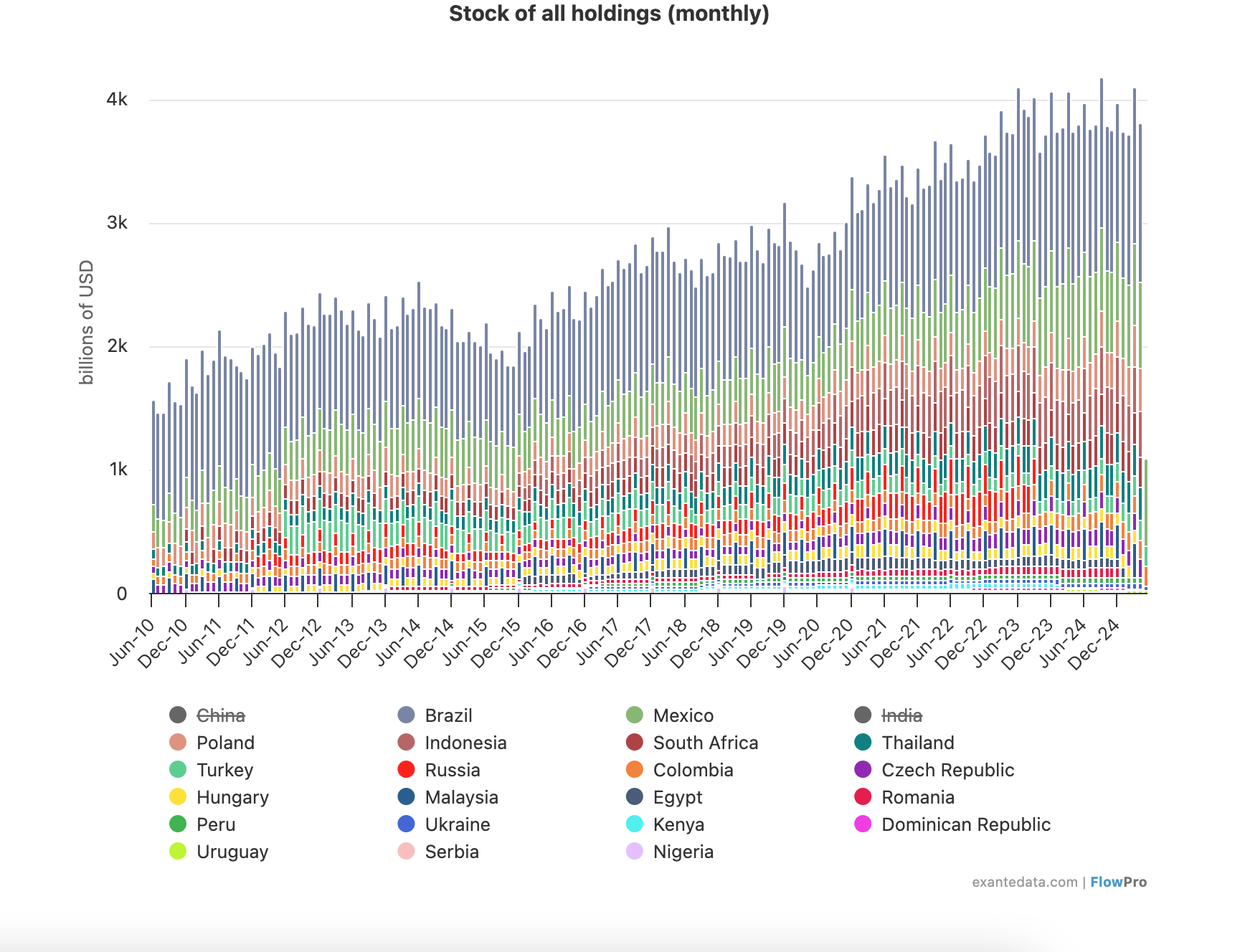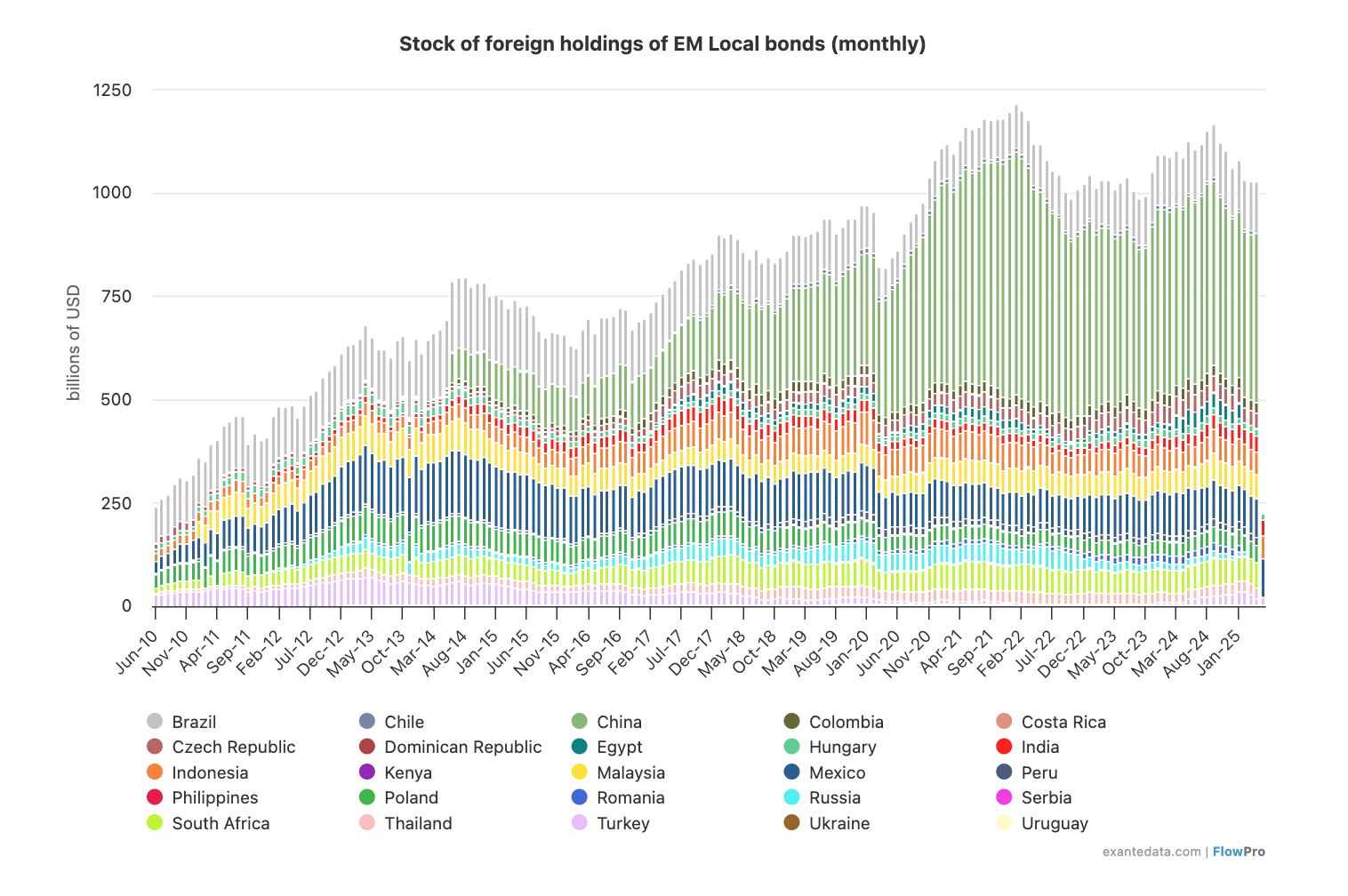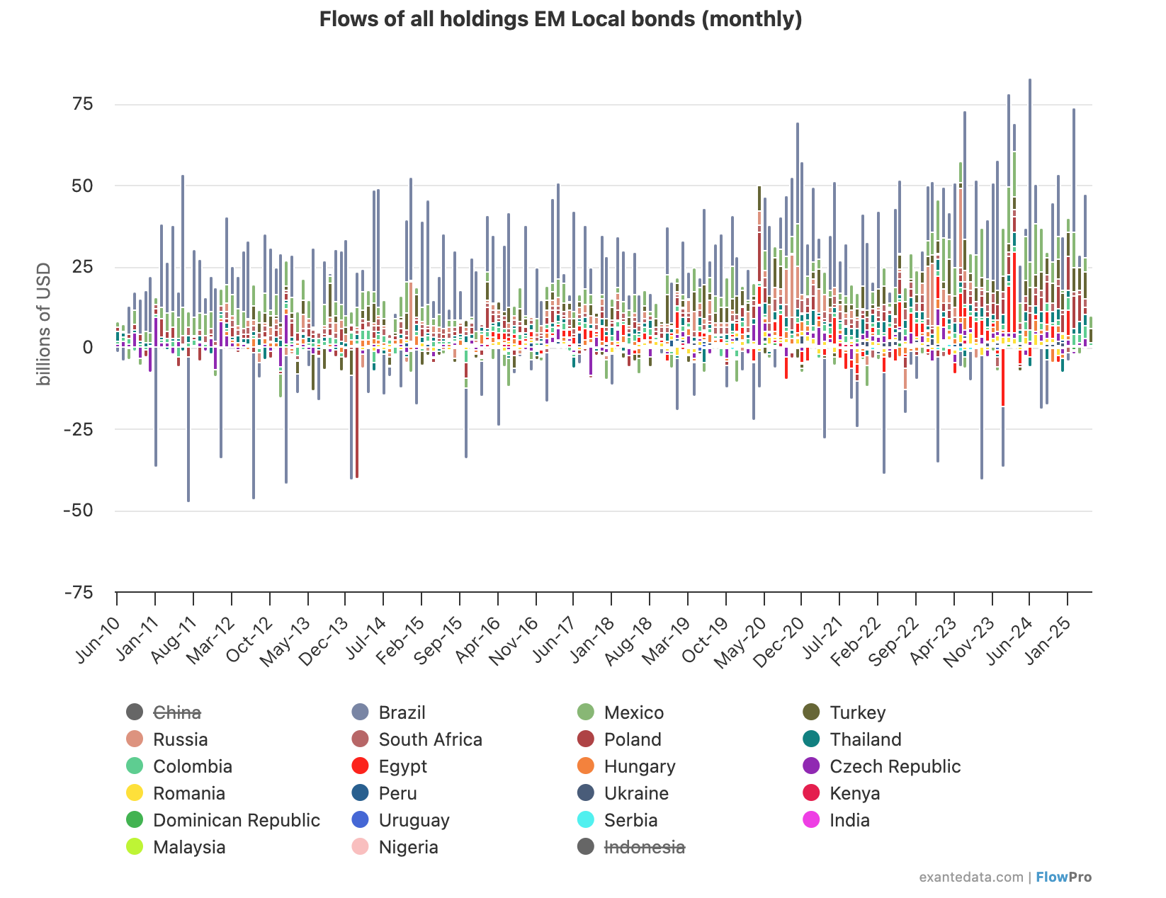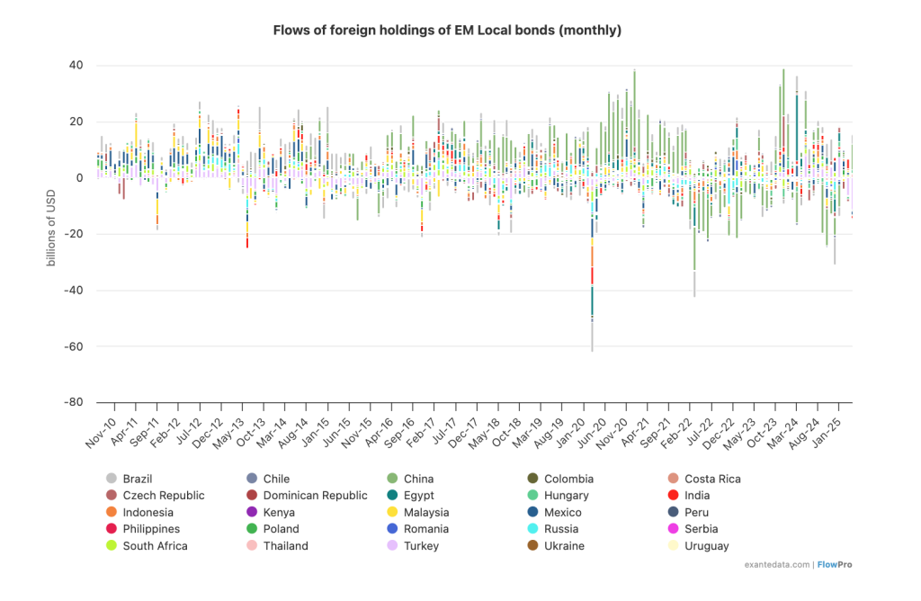 Although there are around one hundred and fifty EM economies in the world, there are around eighty countries’ bonds – the largest, most actively traded – in the EMBI Global Diversified. It makes little difference to the dynamics of the asset class whether we include or exclude the remaining bond markets. We usually show the dynamics of the eighty GBI-EM GD members (as of June 2025).